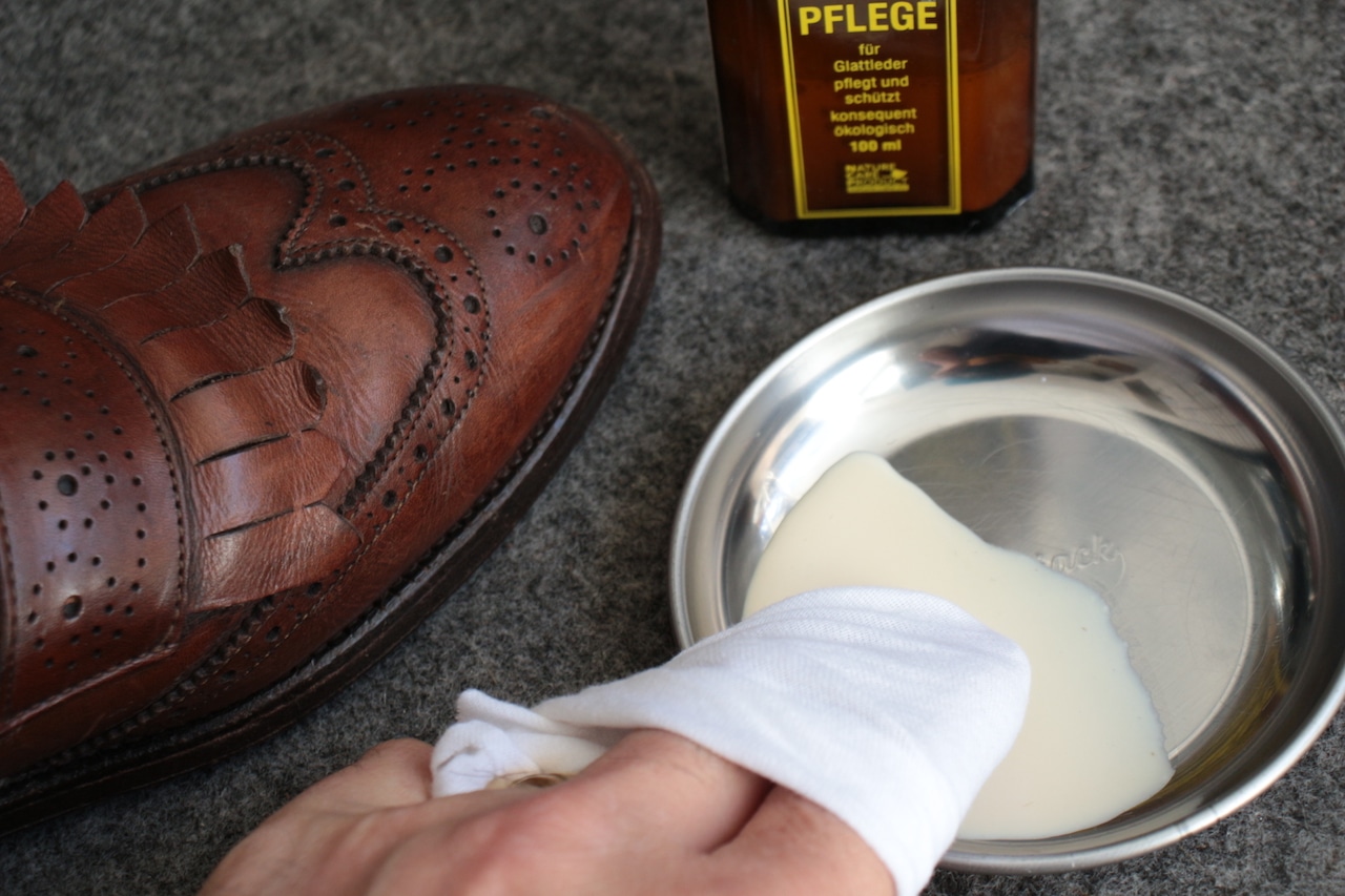 タピールのレーダーフレーゲは乳液タイプで、あらゆる表革製品に使えます。特にデリケートな革製品や大切にしたい革製品、山羊革や羊革などの繊細な革製品、また爬虫類などの革製品にもおすすめです。ホホバオイルが革に栄養を与え、みつろうやカルナバワックスが革の自然な呼吸を妨げることなく保護し、自然な艶をもたらします。