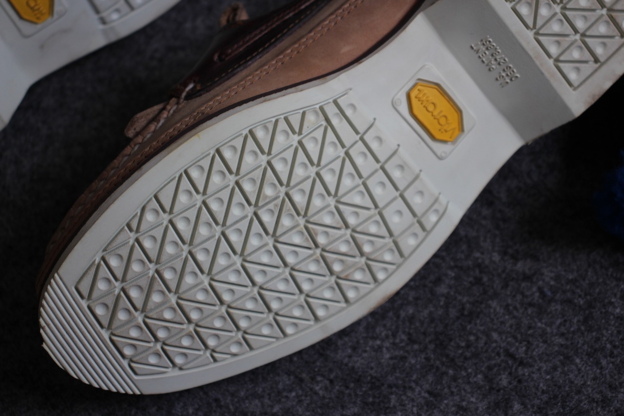 アッパーは、ヌバックとオイルレザーのコンビ。配色も良く、アウトソールのVIBRAMも白を使用しているので、さわやかなルックスです。マッケイ製法。コンディションは、箱なしのデッドストックですが、試着程度はされており、多少のスレなどはありますが、予めご了承ください。