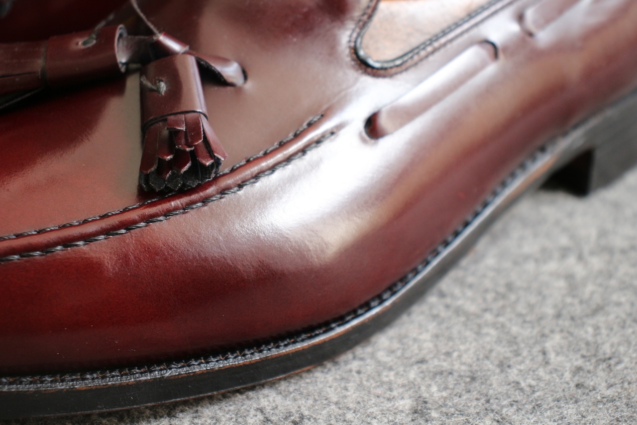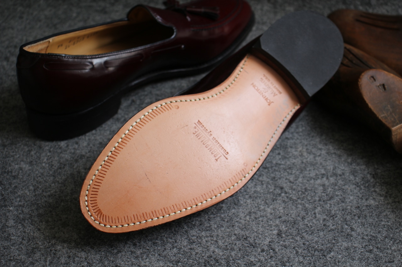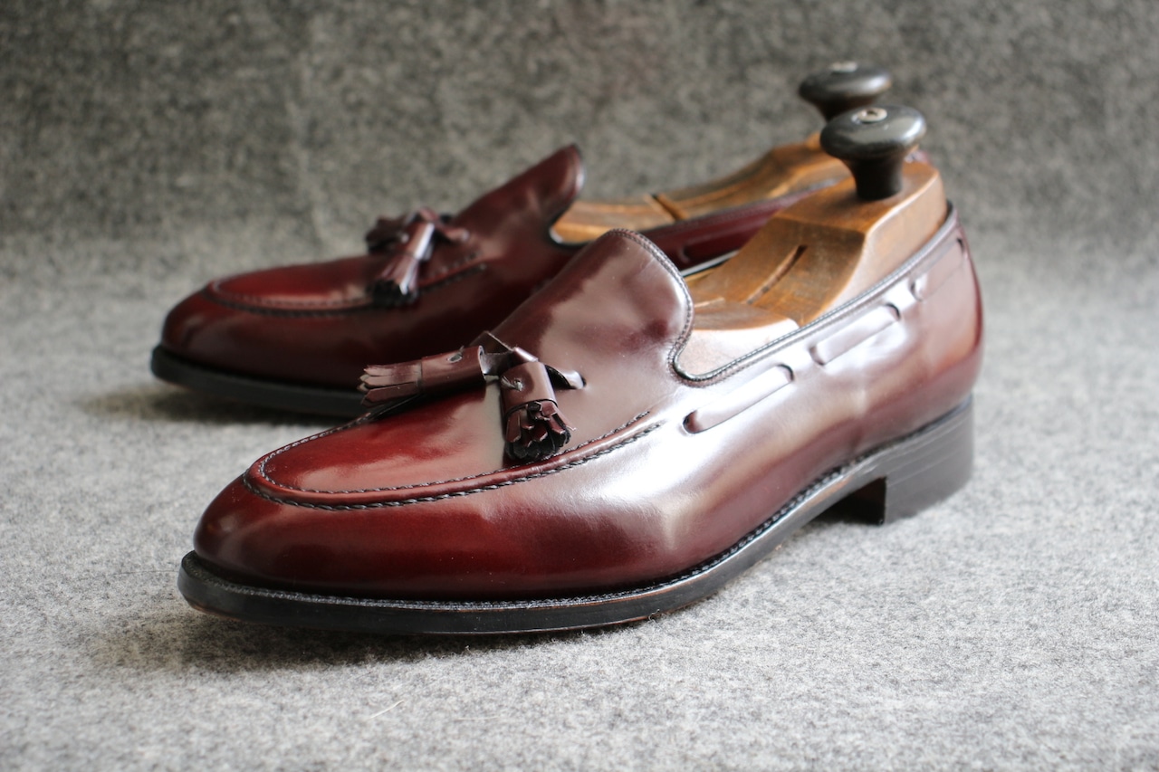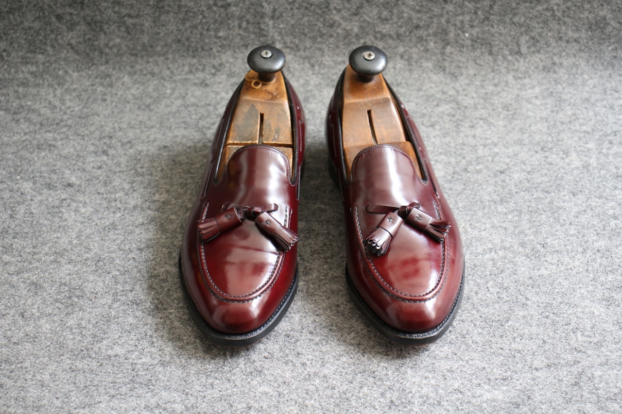 :100年以上の歴史を誇る米国老舗ドレスシューメーカー【Johnston &Murphy】 歴代大統領も愛用していたという逸話もあります。 現在もワールドワイドに展開中の大手アパレルメーカー。 過去には、古靴好きを唸らせる名品が多数存在し、 また、【ARISTOCRAFT】の上級ラインをはじめ、 多くのラインがあった時代もあります。 こちらは、おおよそ80~90年代の生産かと思われますが、 DEERFILED Ⅱとネーミングされたタッセルスリッポン。 超ベーシック、ドレススタイルの基本、タッセル、モカU。 ルックスは、ご覧のとおり、イケメンですが、フィット感は、ウレタン仕様(トランポリンクッションシステム)で 柔らかい履き心地。紐なし靴、スリッポンとしては押さえておきたいドレスシューズです。