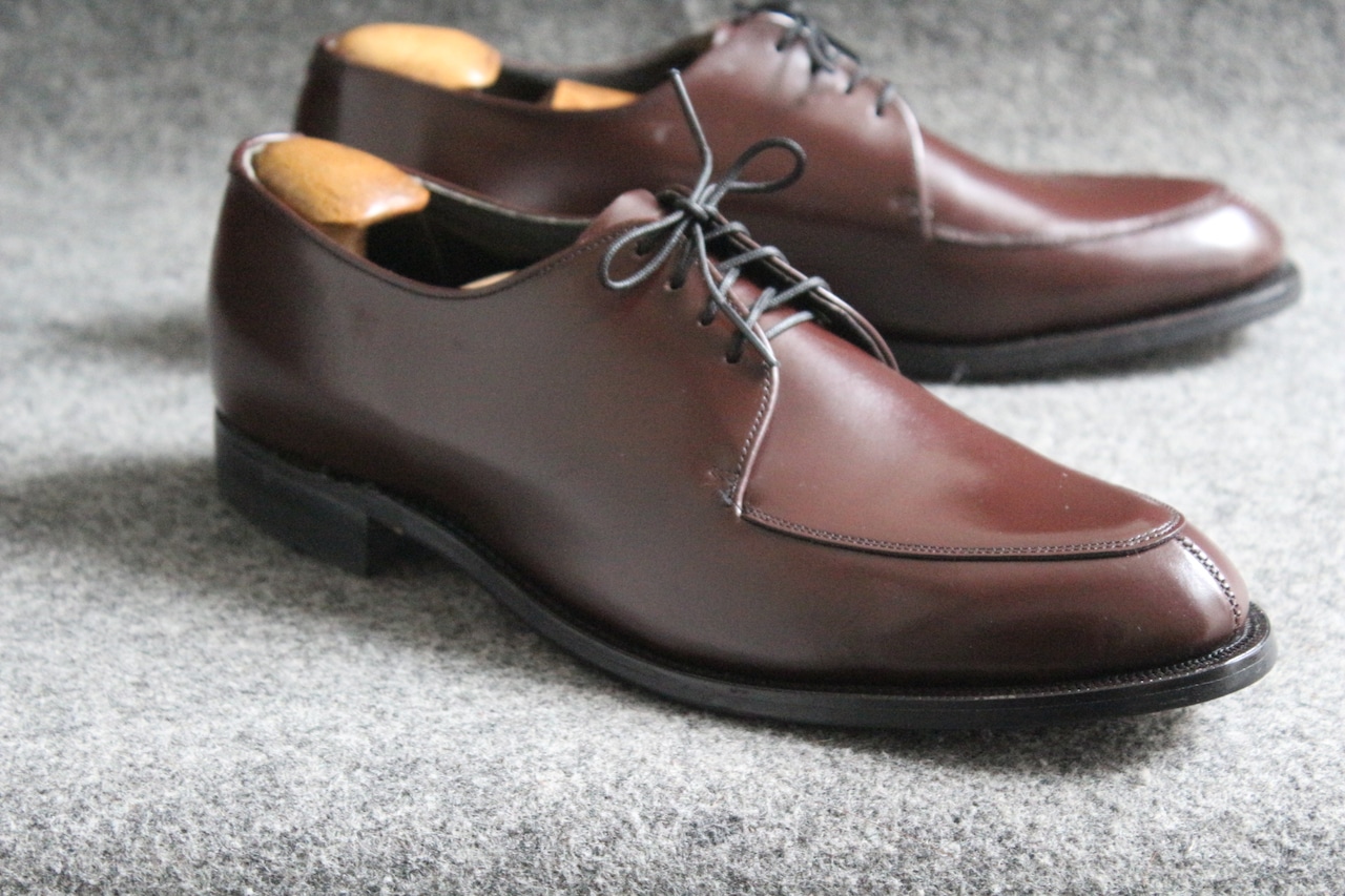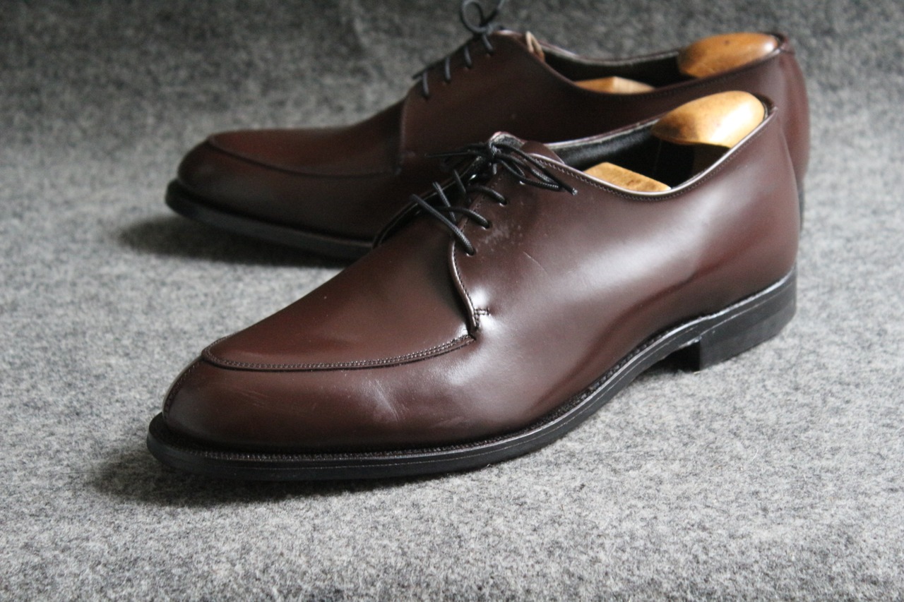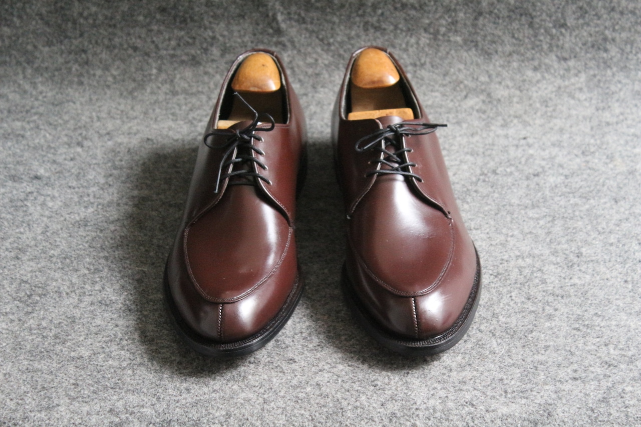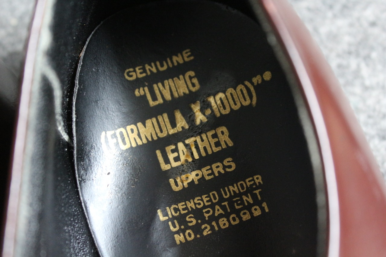 【Lester Brothers Boot and Shoe Company】として、1854年に始まったようですが、【1899年】に【Endicott Johnson shoe co】となったようです。1950年代頃は、ミリタリーブーツの生産も盛んで、一時期は、最大手のシューメーカーになったようです。ワーク系、ドレスシューズをはじめ多くのスタイルの靴を生産していたようですが、ドレスシューズラインとしては、【Guide step】【Endwell】などありますが、ユーズド、デッド市場でも、非常に球数の少ない状況です。こちらは、おおよそ60年代後半の生産でしょうか、Uチップ、4アイレット【Guidestep】ライン。アーチサポート感の高い立体感のあるフィット感。アッパーには、LIVING LEATHER(Formula X-1000)というレザーを使用。広告によると、キズや水に強いタンニンされたレザーとのことですが、当時の大衆系のクオリティかと思います。60年代らしい細身のフォルム。アウトソールには、LINOL LEATHER SOLEと刻印されておりますが、linoleum の略?リノリウムフィニッシュ?!というものなのでしょうか。リノリウムは、艦船の甲板、学校や病院など、日本国内で幅広く普及していた「床材」のようですが、詳細は分かりませんが、耐久性を高めたレザーということかと思います。綺麗なフォルムも特徴的。クッション製の高いインソール仕様。 GOODYEAR WELTED製法。ライニングは前方は、ファブリック。ウェルトにもレザーを使用。コンディションは、箱ありデッドストックですですが、多少のスレなどはありますが、綺麗な状態です。