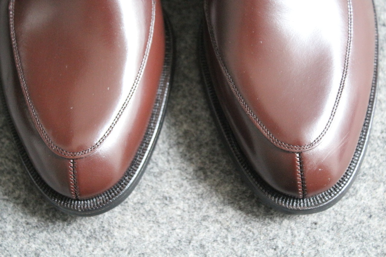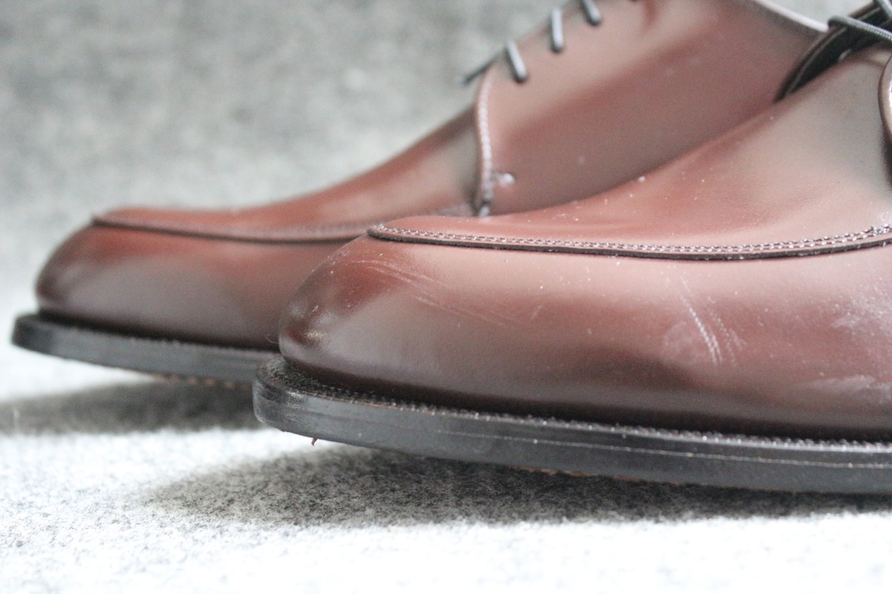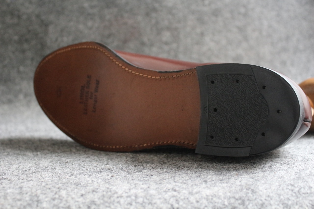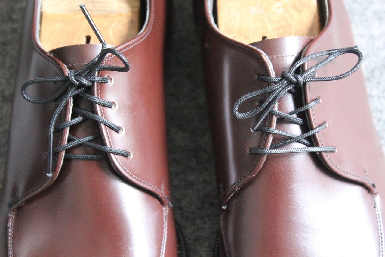 【Lester Brothers Boot and Shoe Company】として、1854年に始まったようですが、【1899年】に【Endicott Johnson shoe co】となったようです。1950年代頃は、ミリタリーブーツの生産も盛んで、一時期は、最大手のシューメーカーになったようです。ワーク系、ドレスシューズをはじめ多くのスタイルの靴を生産していたようですが、ドレスシューズラインとしては、【Guide step】【Endwell】などありますが、ユーズド、デッド市場でも、非常に球数の少ない状況です。こちらは、おおよそ60年代後半の生産でしょうか、Uチップ、4アイレット【Guidestep】ライン。アーチサポート感の高い立体感のあるフィット感。アッパーには、LIVING LEATHER(Formula X-1000)というレザーを使用。広告によると、キズや水に強いタンニンされたレザーとのことですが、当時の大衆系のクオリティかと思います。60年代らしい細身のフォルム。アウトソールには、LINOL LEATHER SOLEと刻印されておりますが、linoleum の略?リノリウムフィニッシュ?!というものなのでしょうか。リノリウムは、艦船の甲板、学校や病院など、日本国内で幅広く普及していた「床材」のようですが、詳細は分かりませんが、耐久性を高めたレザーということかと思います。綺麗なフォルムも特徴的。クッション製の高いインソール仕様。 GOODYEAR WELTED製法。ライニングは前方は、ファブリック。ウェルトにもレザーを使用。コンディションは、箱ありデッドストックですですが、多少のスレなどはありますが、綺麗な状態です。