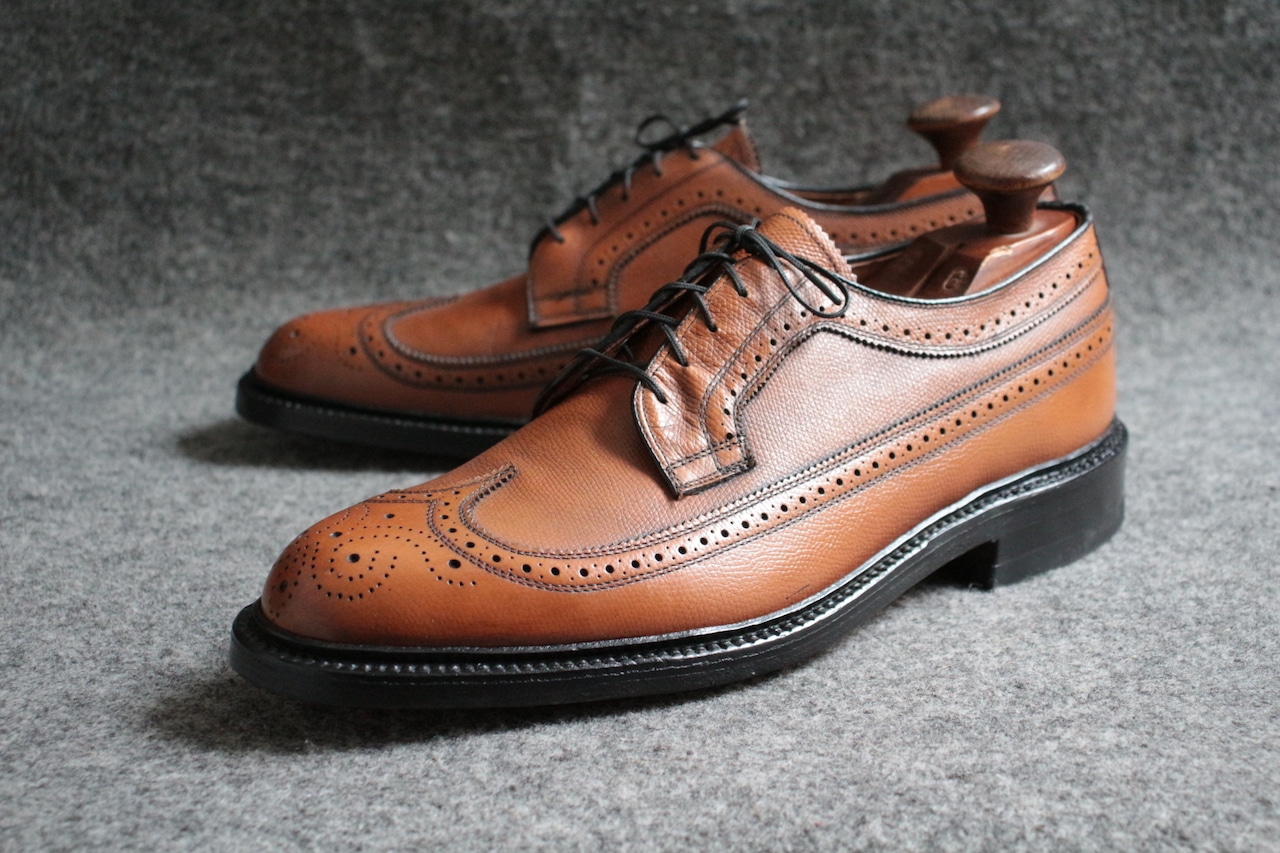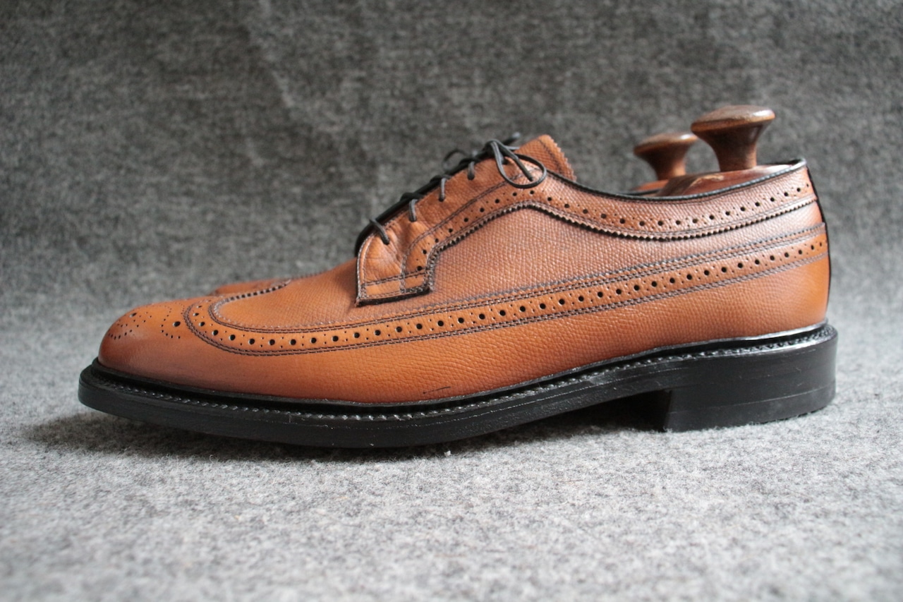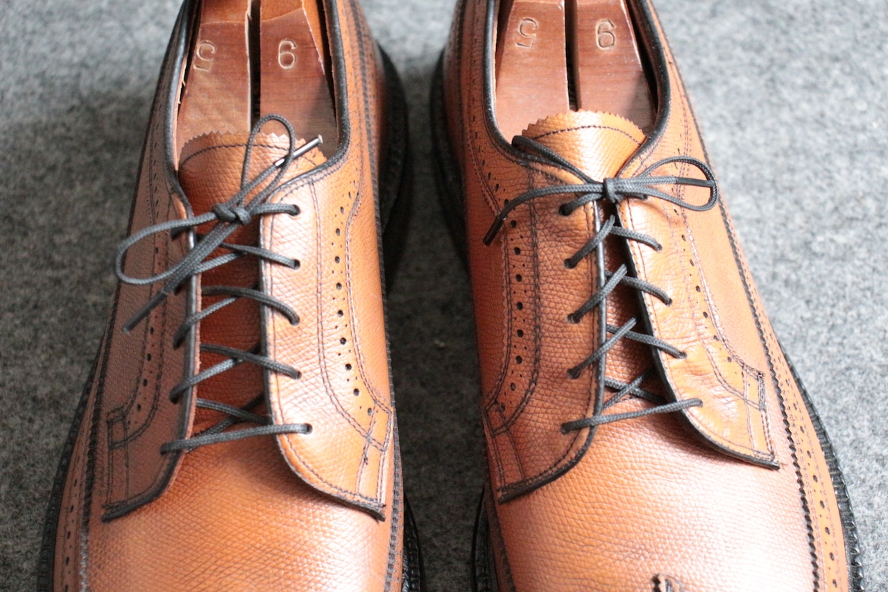 100年以上の歴史を誇る米国老舗ドレスシューメーカー【Johnston &Murphy】 歴代大統領も愛用していたという逸話もあります。 現在もワールドワイドに展開中の大手アパレルメーカー。 過去には、古靴好きを唸らせる名品が多数存在し、 また【ARISTOCRAFT】の上級ラインをはじめ、 多くのラインがあった時代もあります。 こちらは、おおよそ80年代頃の生産かと思われます、当時の上級ライン【ARISTOCRAFT】ライン。 5アイレット、ロングウィング。J&Mのロングウィングは、フラットウェルトがい多く ストームウェルト物は少ない印象です。 こちらは、ストームウェルトが使用されておりますので、定番のアメリカンロングウィング。 質感も良く、安心感のあるARISTOCRAFT。 GOODYEAR WELTED製法、ライニングもフルレザー。インソール、ウェルトにはレザーを使用。 コンディションは、箱なしですが、デッドストック、未使用品です。多少のスレはありますが、予めご了承ください。